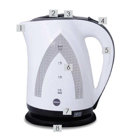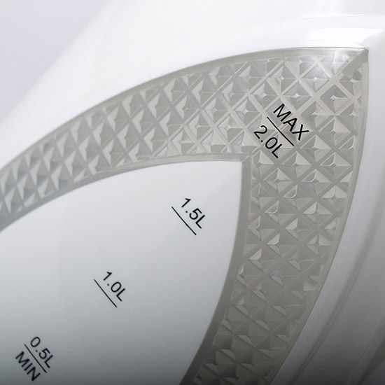 Wyposażony w filtr siatkowy zabezpieczający przed kamieniem powstającym w trakcie gotowania wody. W podstawie dzbanka zaprojektowano miejsce dla nadmiaru przewodu zasilającego.