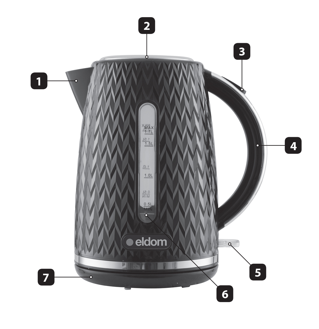 Na wskaźniku (6) zaznaczona jest minimalna (0,5l) i maksymalna (1,7l) ilość gotowanej wody.