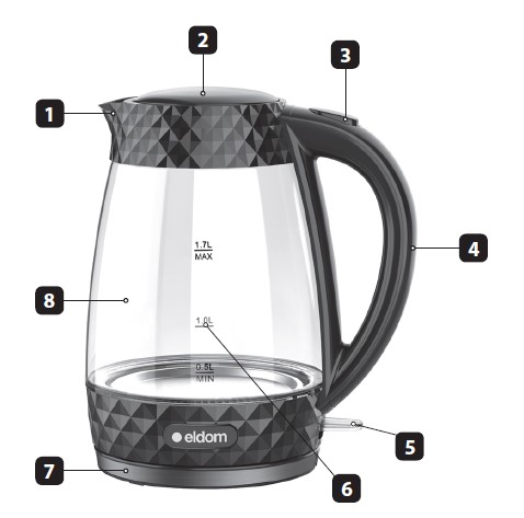 Na wskaźniku (6) zaznaczona jest minimalna (0,5l) i maksymalna (1,7l) ilość gotowanej wody.