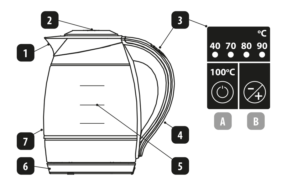 Praca urządzenia sygnalizowana jest podświetleniem zbiornika (7). Kolor podświetlenia zależy od wybranej temperatury. Po osiągnięciu zadanej temperatury, czajnik wyłączy się.