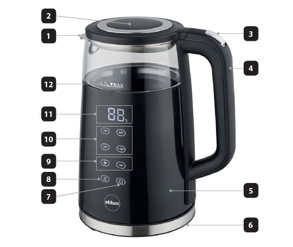 − Po postawieniu czajnika na podstawie podłączonej do zasilania wskaźniki (7-11) zostaną podświetlone. Jeśli w ciągu 1 minuty nie zostanie wykonana żadna operacja czajnik automatycznie przejdzie w tryb czuwania – będzie tylko podświetlony przycisk (7).