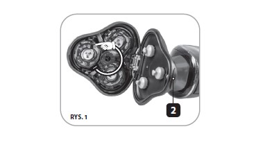 - Po każdym goleniu należy opróżnić komorę noży tnących. W tym celu otworzyć głowicę wciskając przycisk (2) oraz zdjąć mocowanie ostrzy przekręcając delikatnie pokrętło (rys. 1). Do czyszczenia używać dołączonego pędzelka .