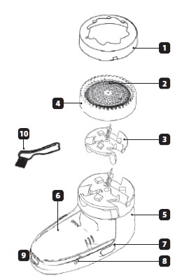 - za pomocą szczoteczki (10) wyczyścić osłonę, nożyk oraz mechanizm napędowy, rys. 3, 4, 5