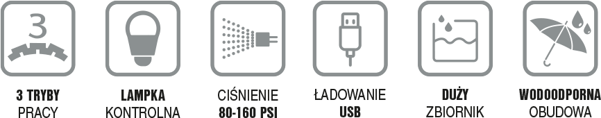 | Ciśnienie | 80 – 160 PSI (5,5 – 11 Bar) |