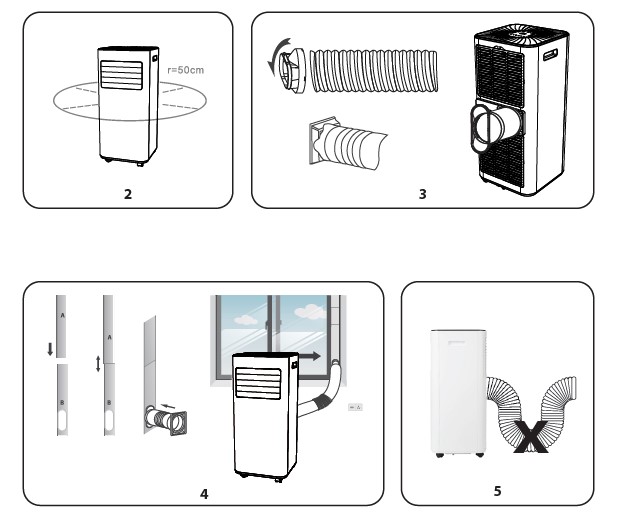 - Instalacja klimatyzatora nie wymaga specjalistycznej wiedzy i może być przeprowadzona przez użytkownika we własnym zakresie, zgodnie ze wskazówkami i diagramami zawartymi w niniejszej instrukcji obsługi. Nieprawidłowa instalacja może być przyczyną wycieku wody, porażenia prądem i nieodwracalnie uszkodzić urządzenie. Firma Eldom Sp. z o. o. nie ponosi odpowiedzialności za ewentualne szkody powstałe w wyniku niewłaściwego używania urządzenia.