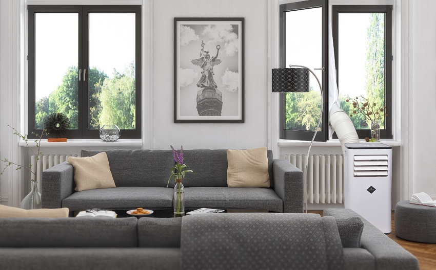 - klimatyzator nie wymaga specjalistycznego montażu – wystarczy rurę odprowadzającą ciepło zamontować w urządzeniu i wyprowadzić na zewnątrz, np. przez okno,