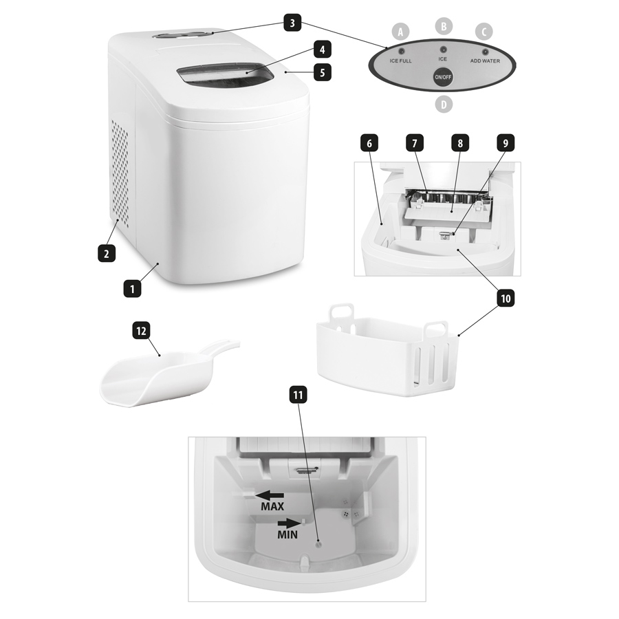 - włączenie się kontrolki „C” i jednoczesny sygnał dźwiękowy informuje, że poziom wody jest zbyt mały na pełny cykl produkcji lodu. W takim przypadku należy wyciągnąć i opróżnić pojemnik (10), następnie dolać wody, włożyć pojemnik (10) z powrotem i nacisnąć przycisk „D” w celu ponownego uruchomienia urządzenia.