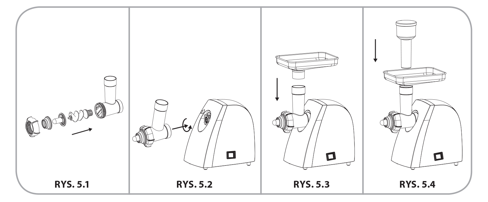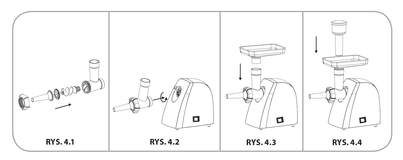 • W komorze mielenia (5) umieścić kolejno: ślimak (6), separator (11) oraz nasadkę masarską (10) i nakręcić nakrętkę (9) – RYS. 4.1.