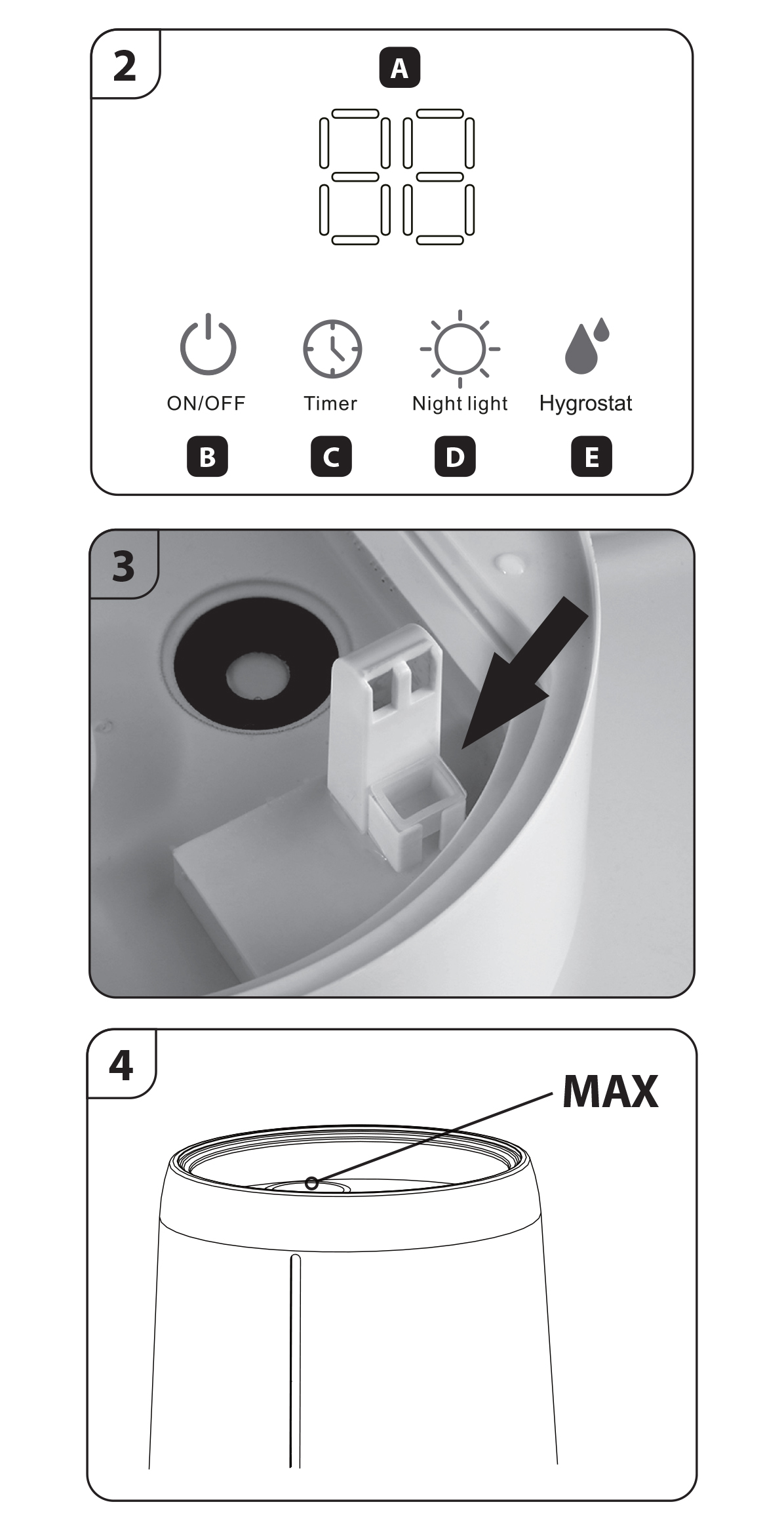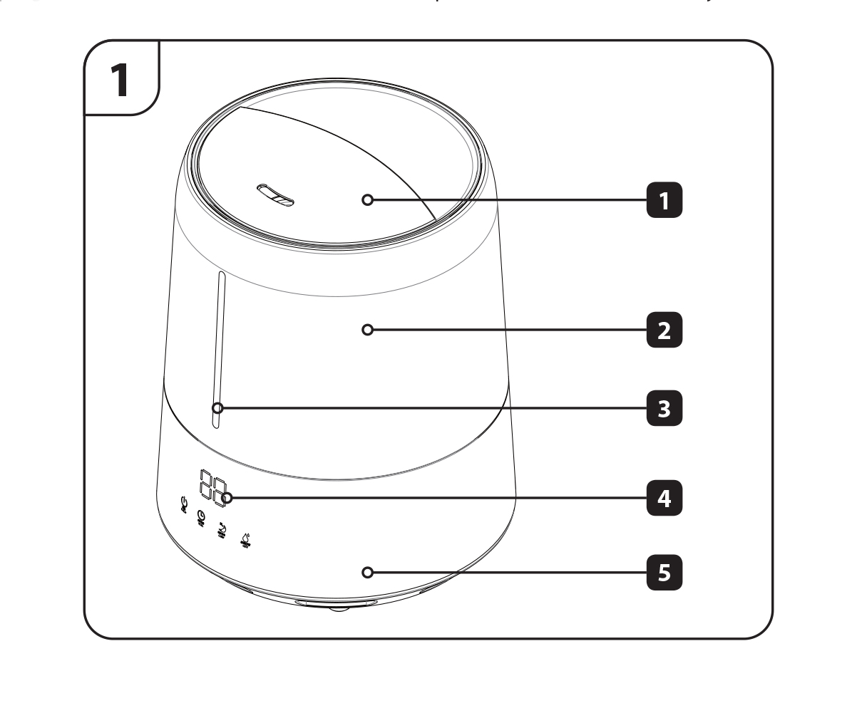 Po naciśnięciu przycisku (B) włącza się wyświetlacz (A). Nawilżacz zaczyna pracować na najniższym poziomie nawilżania – pracuje silnik wentylatora. Wyświetlany jest poziom wilgotności.