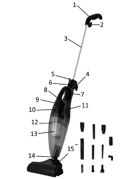 UWAGA. Nie wolno korzystać z odkurzacza pionowego i ręcznego bez założonego filtra HEPA (13) oraz pojemnika (12).
