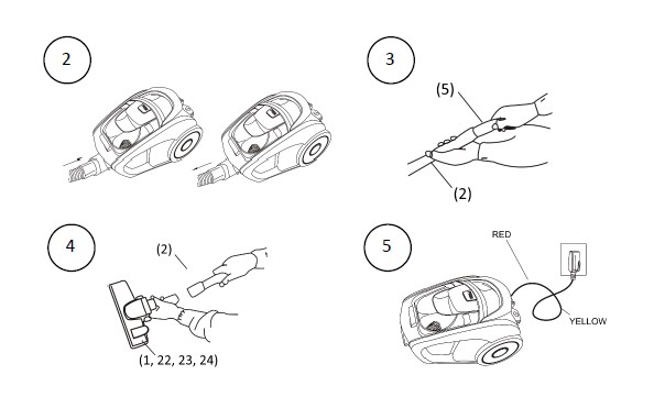 - Odkurzacz rozpoczyna pracę po wciśnięciu włącznika (16).