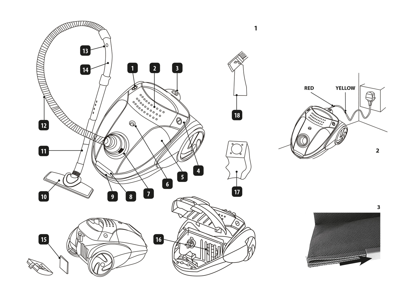 - Nie wolno korzystać z odkurzacza bez założonych filtrów (15, 16) oraz worka (17).