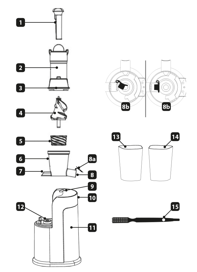 Perfect Juicer posiada wbudowaną blokadę. Funkcja ta powoduje, że urządzenie można włączyć tylko jeśli jest zmontowane poprawnie. Należy zwrócić uwagę, aby przy zakładaniu kolektora (6) na podstawę (11) oraz pokrywy (2) na kolektor (6) odpowiednie znaki zrównały się ze sobą. Po prawidłowym złożeniu, wbudowany mikrowyłącznik (9) zostaje odblokowany.