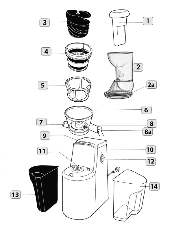 – zawór (8a) zamontowany w otworze wylotowym soku można zamknąć na krótki czas w celu zmiany pojemnika na sok, a po zakończeniu w celu zapobiegania kapaniu resztek soku.