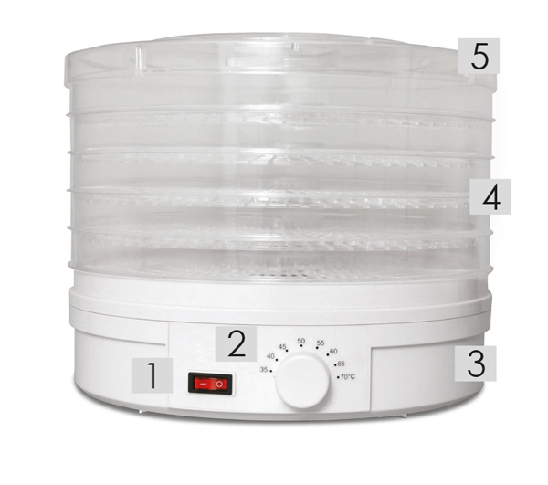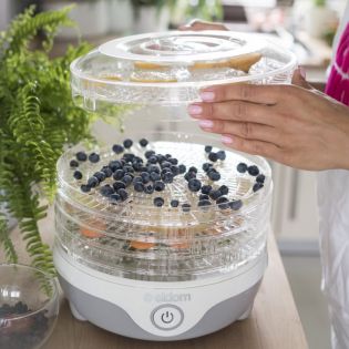 Dzięki niej produkty te zachowają smak, aromat i wartości odżywcze. Urządzenie jest wygodne i bardzo proste w użyciu. Posiada pięć poziomów suszenia, a na każdym z nich - wygodne, duże sita o średnicy 32 cm. Przeźroczysta obudowa pozwala na bieżąco obserwować proces osuszania, a funkcja regulacji temperatury daje możliwość dostosowania nadmuchiwanego ciepła do rodzaju suszonych produktów.