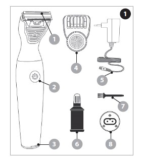 - Urządzenie wyposażone jest w precyzyjna nasadkę (4) pozwalająca przycinać włosy na różna długość.