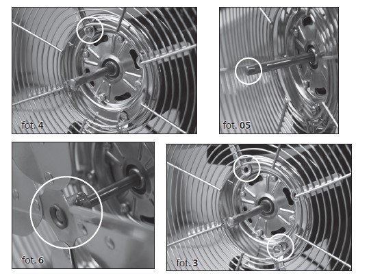 - śmigło (B) nasunąć na sworzeń, fot. 6 tak aby otwór na śrubkę znalazł się dokładnie nad wcięciem na sworzniu fot. 5 i dokręcić za pomocą śrubki (proszę zachować ostrożność, śmigło ma ostre krawędzie),