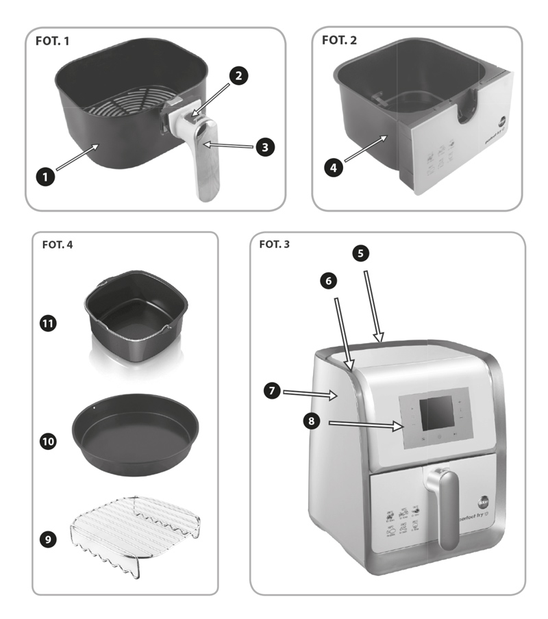 Urządzenie nie będzie działać bez prawidłowo włożonej szuflady (4). Wyciągnięcie szuflady w trakcie pracy urządzenia wyłącza grzałkę (wentylator ciągle działa). Nie wolno dotykać szuflady, kosza oraz wnętrza urządzenia ponieważ są bardzo gorące.