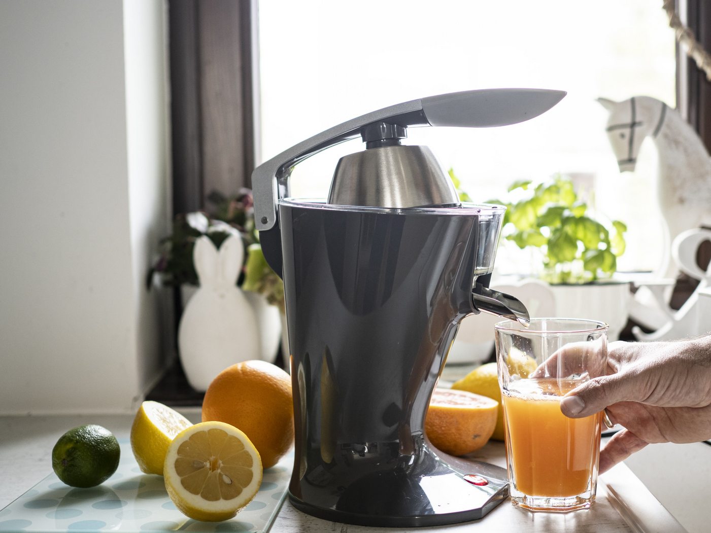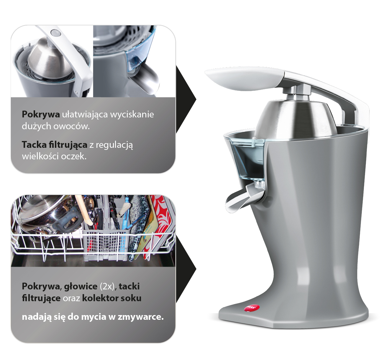 - 2 głowice o różnej wielkości pozwalają na dokładne wyciśnięcie soku z każdego cytrusa
