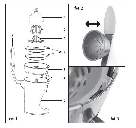Duża głowica (2) przeznaczona jest dla większych owoców (np. pomarańcze), przy wyciskaniu których można użyć ramienia (8) z zamontowaną pokrywą (1). Mała głowica (3) przeznaczona jest dla mniejszych owoców (np. cytryna), które należy dociskać ręką.