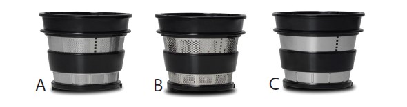 | Filtry (sita) | 3szt: A - filtr z małymi oczkami - rzadki sok ; B - filtr z dużymi oczkami - gęsty sok ; C - filtr do mrożonych owoców |